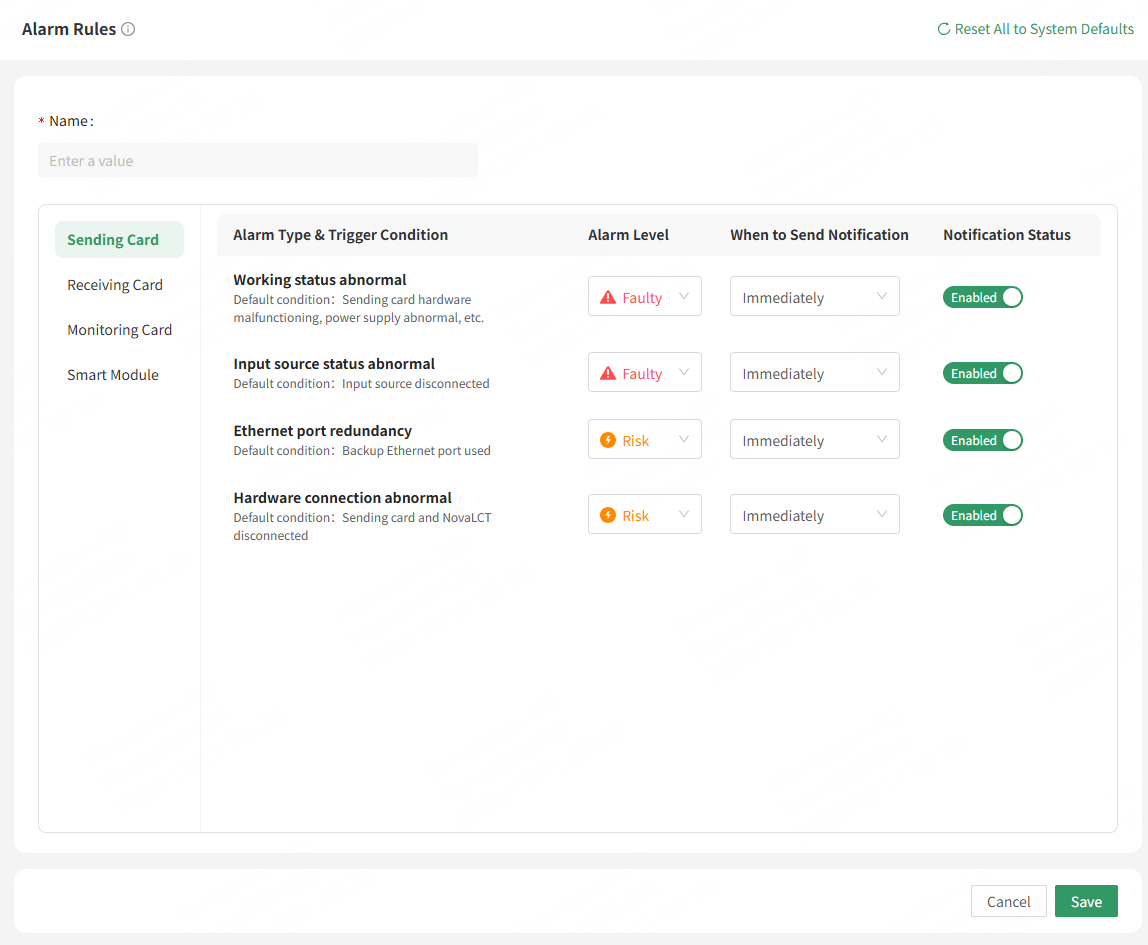 - Click **Reset All to System Defaults** to reset all alarm rules to the system defaults.