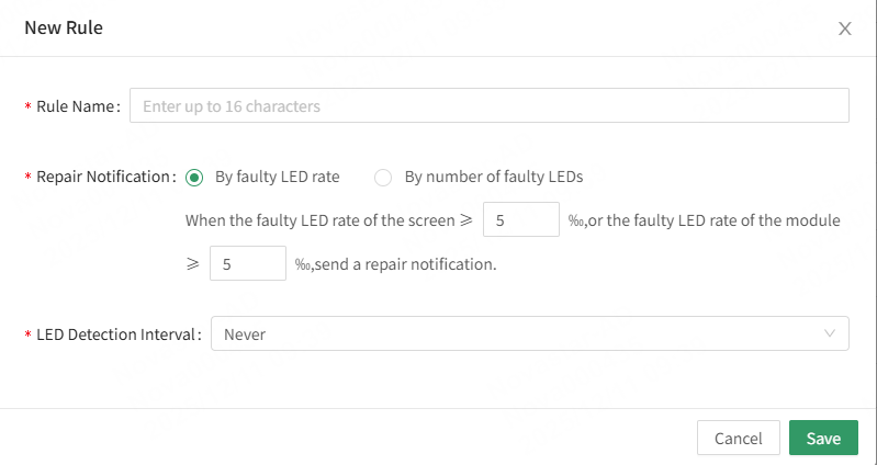 - Repair Notification: Select By faulty LED rate or By number of faulty LEDs and specify the corresponding values.