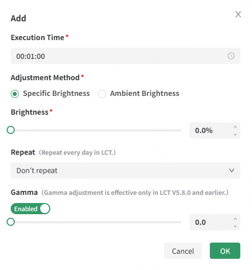 - Brightness: When Specific Brightness is selected as the adjustment method, the brightness value needs to be set. The screen brightness can be adjusted by dragging the slider.