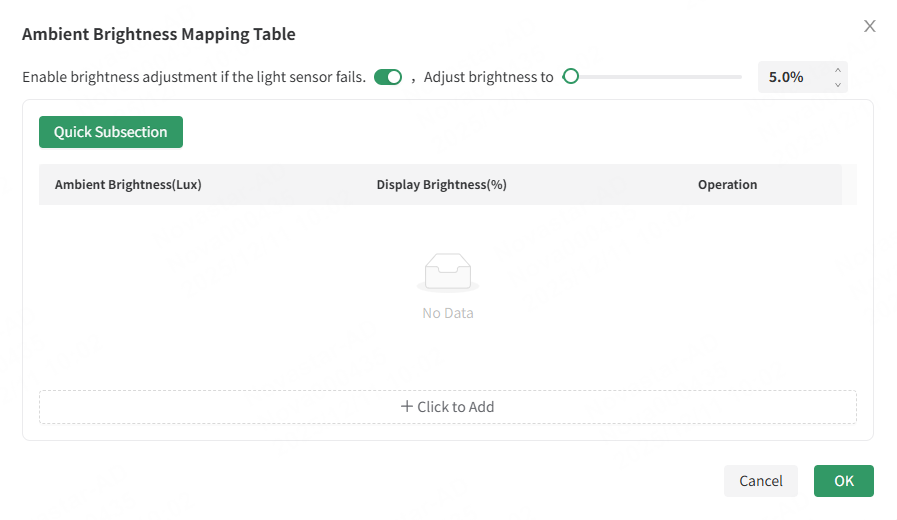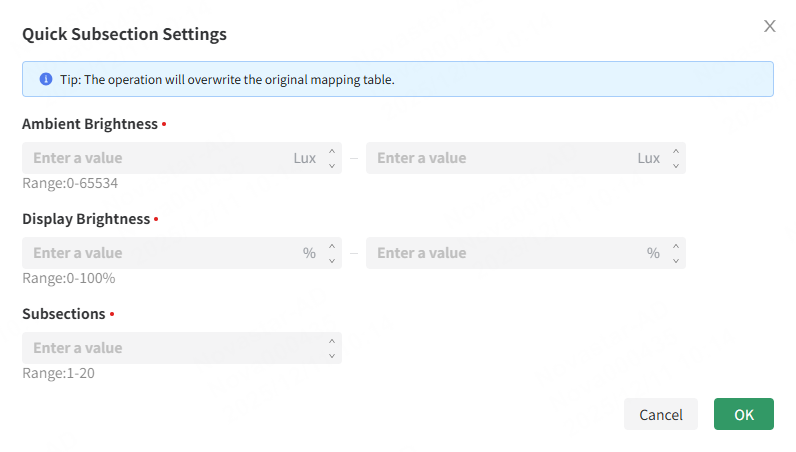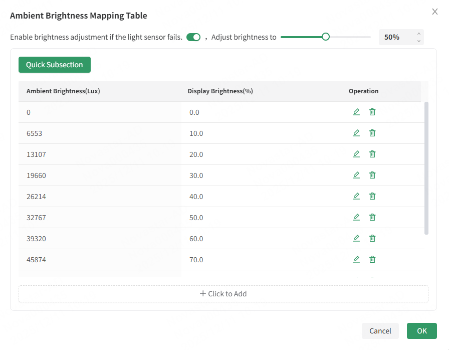 The brightness mapping table divides ambient brightness into several ranges. Specify each range a corresponding screen brightness, then specify the interval and number of times to collect the brightness. The screen brightness automatically adjusts according to the range of the collected ambient brightness.