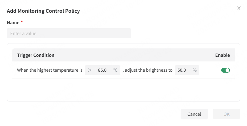 - In the Add Monitoring Control Policy window that appears, enter a template name, set the trigger condition and enable it.