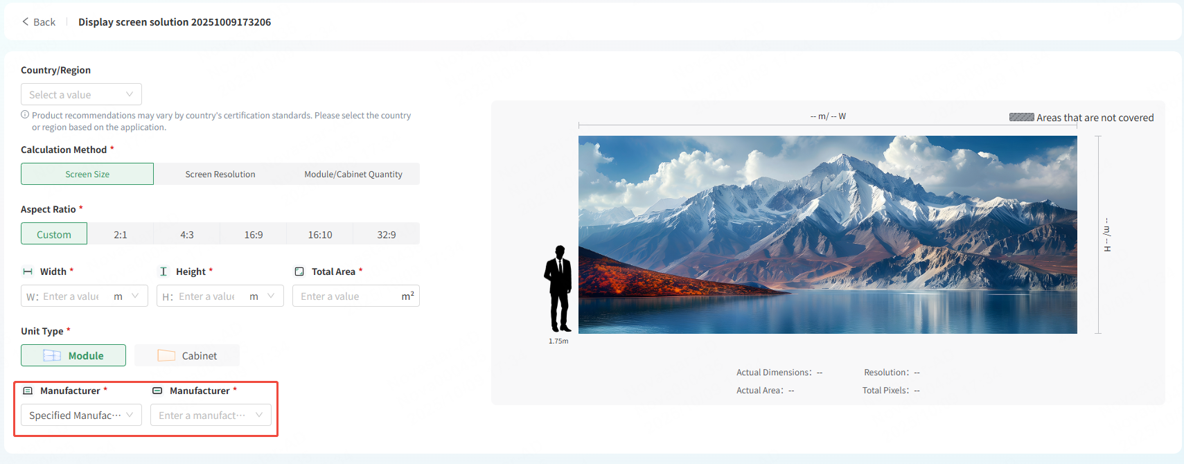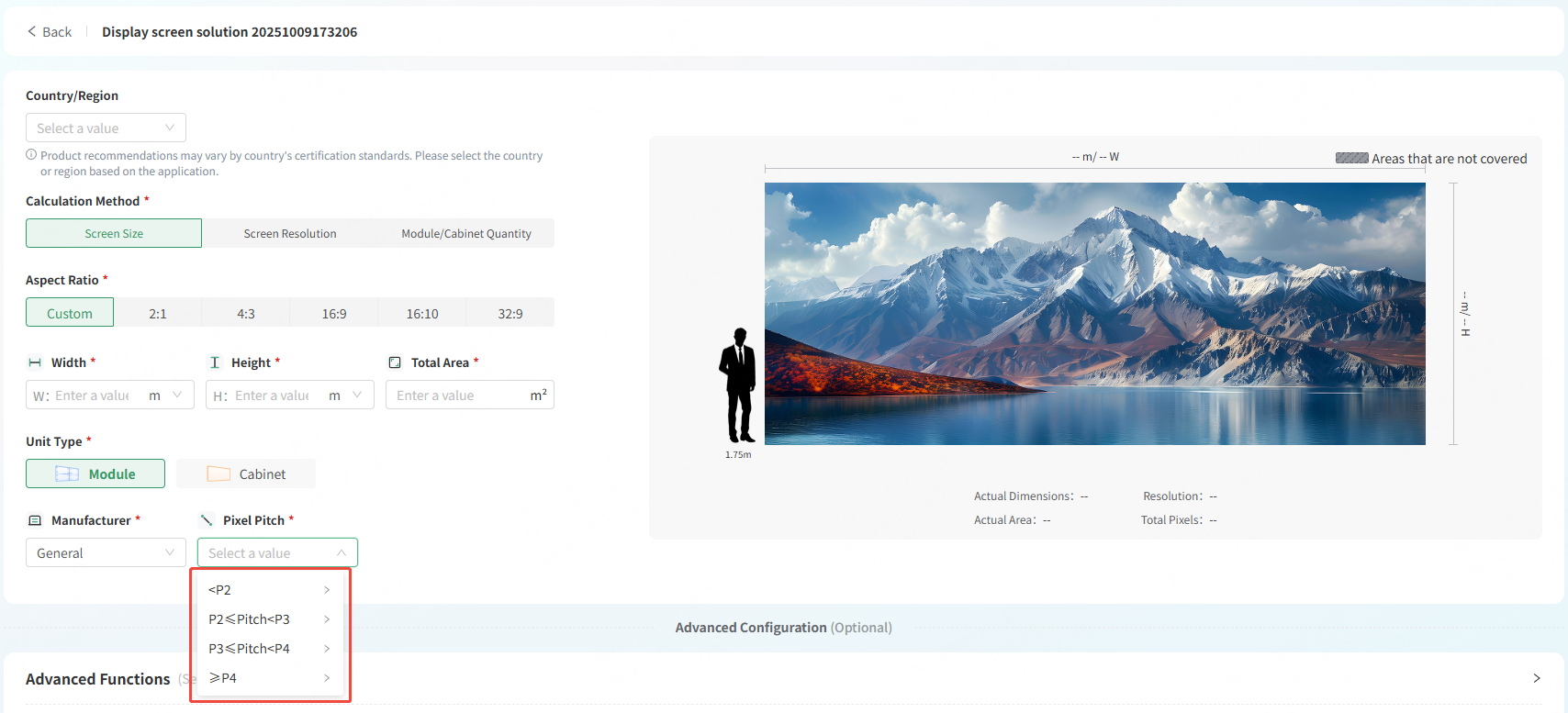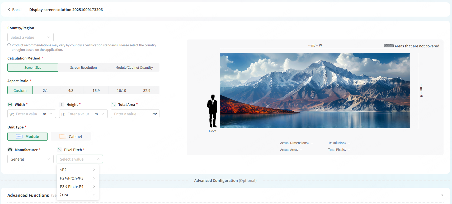 By default, General (previously Others) is selected as the manufacturer and various pixel pitch options are provided for quick selection.