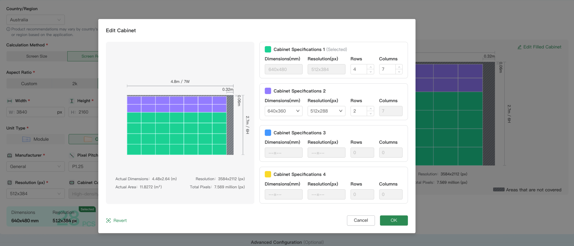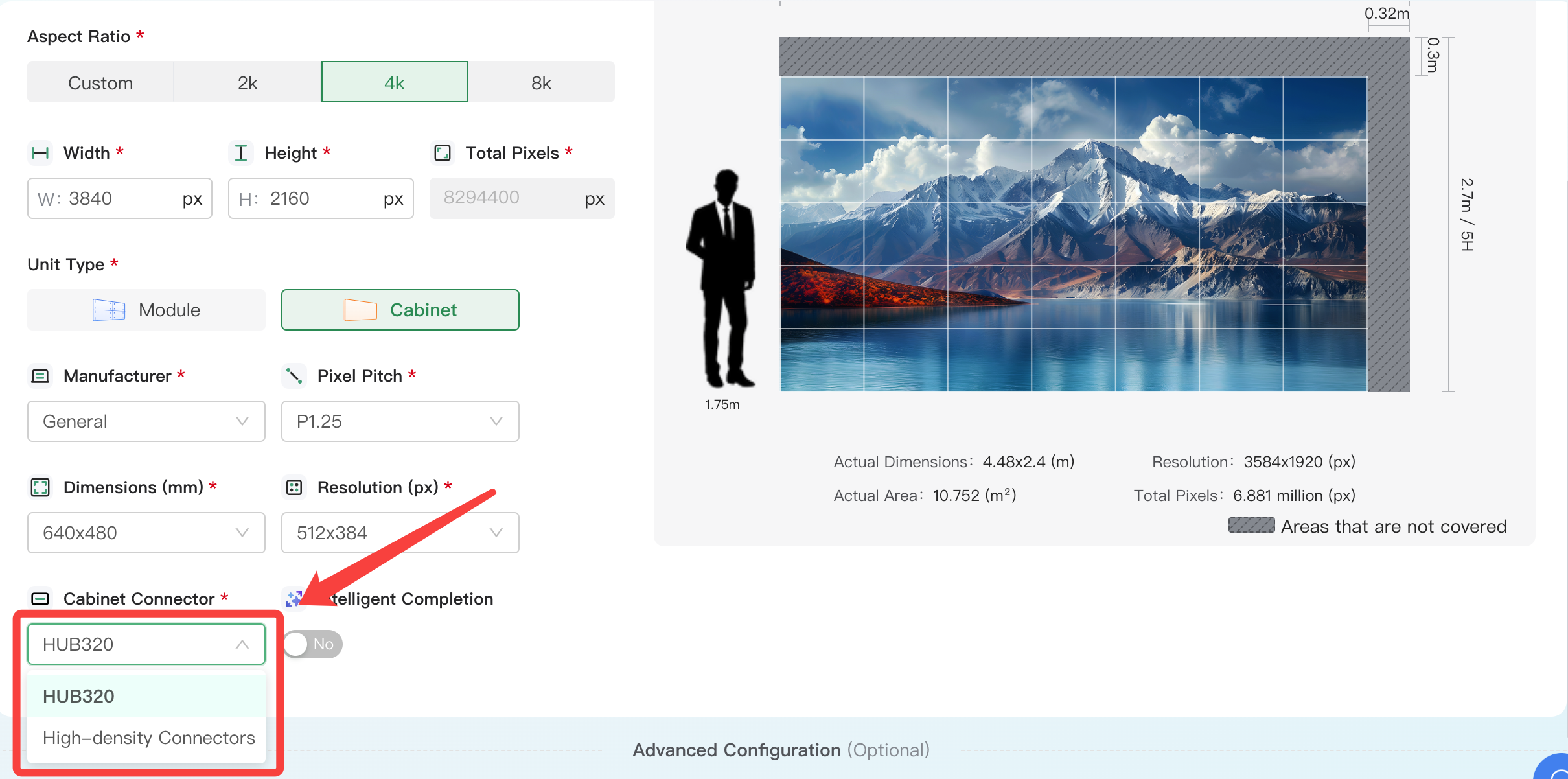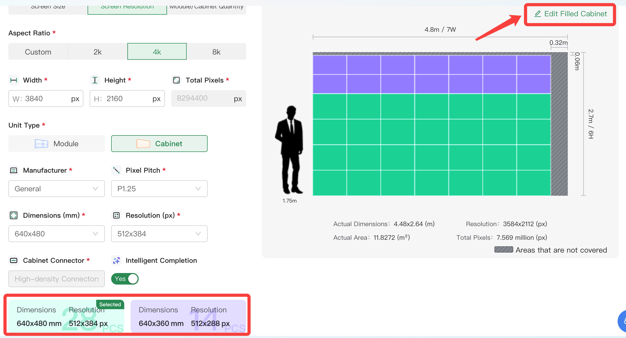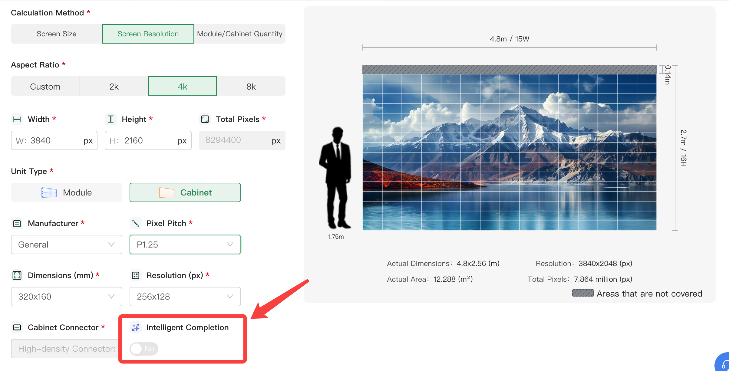 a. Select Screen Size or Screen Resolution as the calculation method, select Cabinet as the unit type, and Intelligent Completion will be displayed.